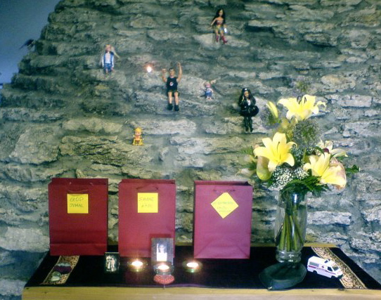 This is the Altar for the 2008 Inner Child 3 Day Residential Weekend in Estonia, which used to be part of Soviet Russia, before Estonian Independence in 1991.Throughout each weekend post-it notes are handed to each participant, to write down thoughts, feelings, emotions and memories as they come up, to be placed at any time into the bags on the Altar as an act of surrender. One is for notes to Spirit Energies you describe for yourself – The GOD BOX. Another is for past SHAMES we call the SIN BIN and the last bag is for RESENTMENTS called THE GRUDGE DRAWER.